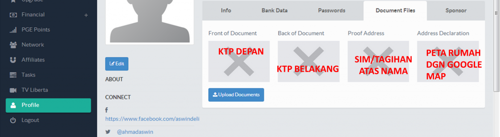 Setelah halaman Personal data , lengkapi data diri anda disana dan langkah selanjutnya adalah upload dokument pribadi anda sesuai dengan pendaftaran pertama anda di Libertagia